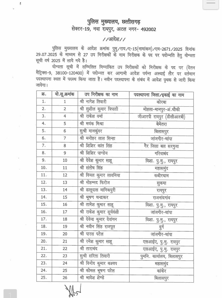 रायपुर: छत्तीसगढ़ पुलिस के 25 सब इंस्पेक्टर का इंस्पेक्टर के पद पर प्रमोशन हुआ है। इसमें रायपुर के 6 सब इंस्पेक्टर भी शामिल है। फिलहाल सभी प्रमोटेड अफसर उसी जिले में सेवा देते रहेंगे, जहां उनकी पोस्टिंग है। डीजीपी ने आदेश में कहा है कि नवीन पदस्थापना आदेश अलग से जारी किया जाएगा।