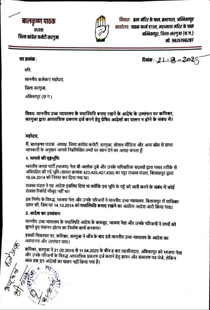 अंबिकापुर: अम्बिकापुर शहर के प्रतापपुर चौक स्थित 100 एकड़ के कब्ज़े की जमीन पर माननीय उच्च न्यायालय बिलासपुर के स्टे ऑर्डर भंग पर कब्जाधारकों के विरुद्ध आपराधिक मामला दर्ज करने के ज्ञापन के साथ कांग्रेस का एक प्रतिनिधि मंडल सरगुजा कलेक्टर से मिला है। प्रतापपुर चौक से गोधानपुर मार्ग पर विस्तृत 100 एकड़ जमीन पर हाईकोर्ट के स्टे आर्डर के अवमानना को लेकर सरगुजा कमिश्नर ने अम्बिकापुर तहसीलदार को 8 बार ज्ञापन भेजा है। कांग्रेस जिलाध्यक्ष ने सरगुजा कलेक्टर के संज्ञान में इस तथ्य को लाते हुए इसे बेहद आपत्तिजनक बताया है और इस मामले में हाईकोर्ट के स्टे की अवमानना करने वाले लोगों पर कारवाई नहीं होने पर सड़क पर उतर आंदोलन की चेतावनी दी है।