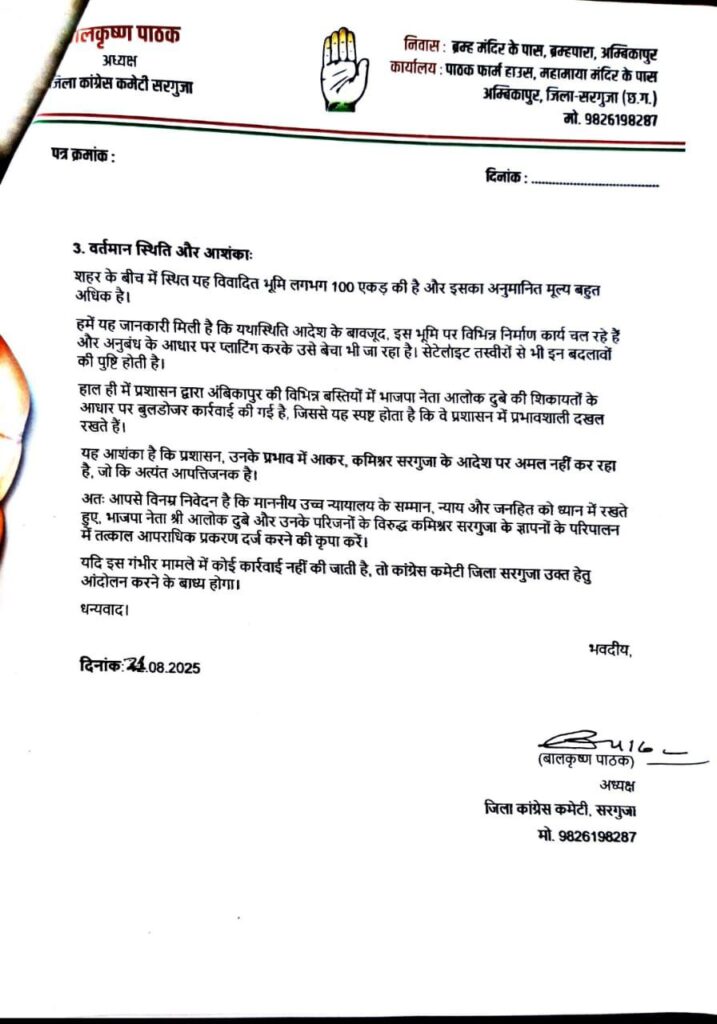 कांग्रेस अध्यक्ष बालकृष्ण पाठक ने कलेक्टर सरगुजा से चर्चा में यह तथ्य भी प्रकाश में लाया कि प्रतापपुर चौक के करीब की बेशकीमती 100 एकड़ जमीन के कब्जाधारी लोगों के षड़यंत्र का खामियाजा गोधानपुर और फुन्दूर डिहारी के 15 हजार निवासियों को उठाना पड़ रहा है। राजस्व न्यायालय से यह स्पष्ट हो जाने के बाद प्रतापपुर चौक की 100 एकड़ बेशकीमती जमीन पर कब्जेदारों का कोई मालिकाना हक नहीं है। ऐसी युक्तियों को आजमाया गया जिसके फलस्वरूप कलेक्टर सरगुजा ने कब्जा की गई भूमि के साथ ही गोधानपुर और फुन्दूर डिहारी की समस्त जमीन के क्रय, विक्रय, डायवर्सन, निर्माण पर रोक लगा दिया। कांग्रेस जिलाध्यक्ष ने कलेक्टर सरगुजा को कहा कि क्या कब्जाधारी परिवार का एक सदस्य जो भाजपा का बड़ा नेता और पार्षद है के दबाव में तहसीलदार सरगुजा हाईकोर्ट के स्टे ऑर्डर की अवमानना को लेकर आपराधिक प्रकरण दर्ज करने के कमिश्नर के आदेश को नहीं मान रहे हैं। कांग्रेस जिलाध्यक्ष ने कहा कि शहर के बेशकीमती भूमि पर खुद काबिज इस प्रभावशाली भाजपा नेता ने अवैध कब्जे के नाम पर शहर के सैकड़ों परिवारों का आशियाना उजाड़ने का आवेदन प्रशासन को दिया जिसपर प्रशासन ने करवाई की है। लेकिन भाजपा के इस प्रभावशाली नेता और उसका परिवार जो खुद 100 एकड़ बेशकीमती जमीन का कब्जाधारी के द्वारा माननीय उच्च न्यायालय के आदेश के उल्लंघन के बावजूद उसपर करवाई नहीं हो रही है। कांग्रेस जिलाध्यक्ष ने विवादित भूमि को छोड़ गोधानपुर और फुन्दूर डिहारी के जमीन पर लगी रोक हटाने के साथ ही कमिश्नर के आदेशानुसार कब्जाधारी भाजपा नेता और उसके परिवार पर कार्यवाही नहीं होने की स्थिति में आंदोलन की चेतावनी दी है।