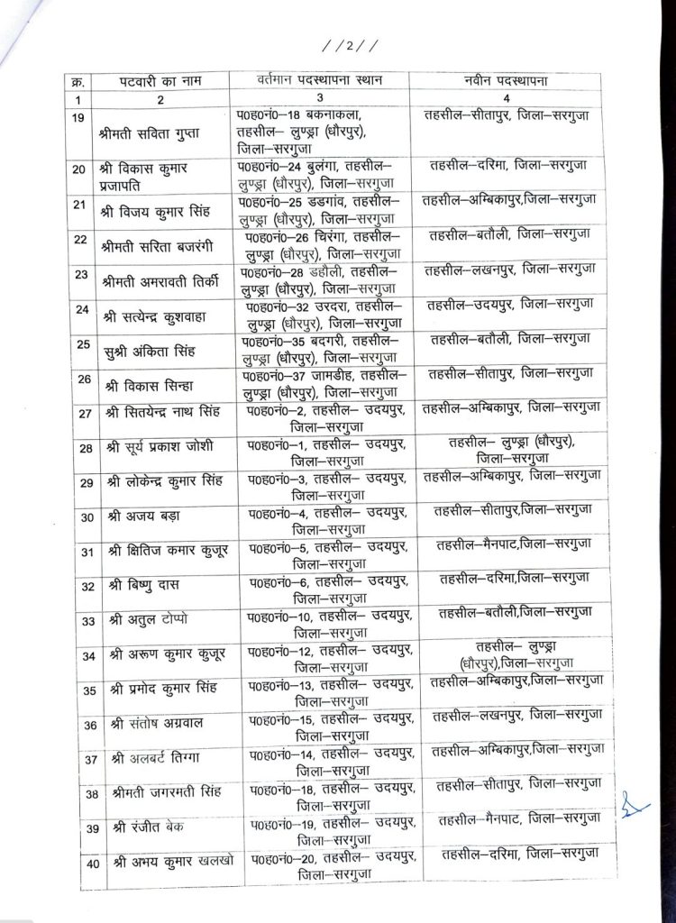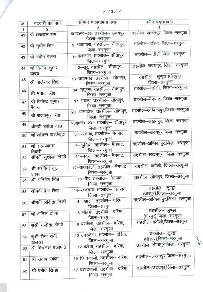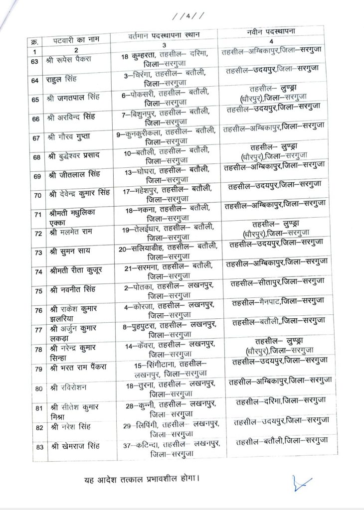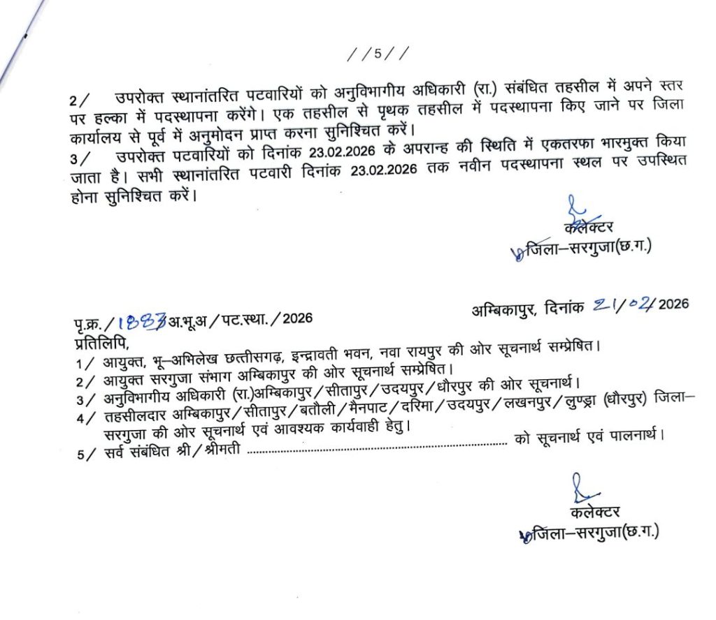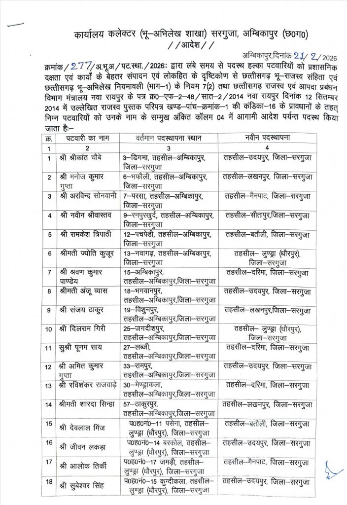 अम्बिकापुर: सरगुजा जिले में राजस्व प्रशासन में बड़ा फेरबदल करते हुए कलेक्टर अजित वसंत ने एक साथ 83 पटवारियों के तबादले का आदेश जारी किया है। लंबे समय से एक ही स्थान पर पदस्थ पटवारियों को हटाकर उन्हें ग्रामीण क्षेत्रों की जिम्मेदारी सौंपी गई है।